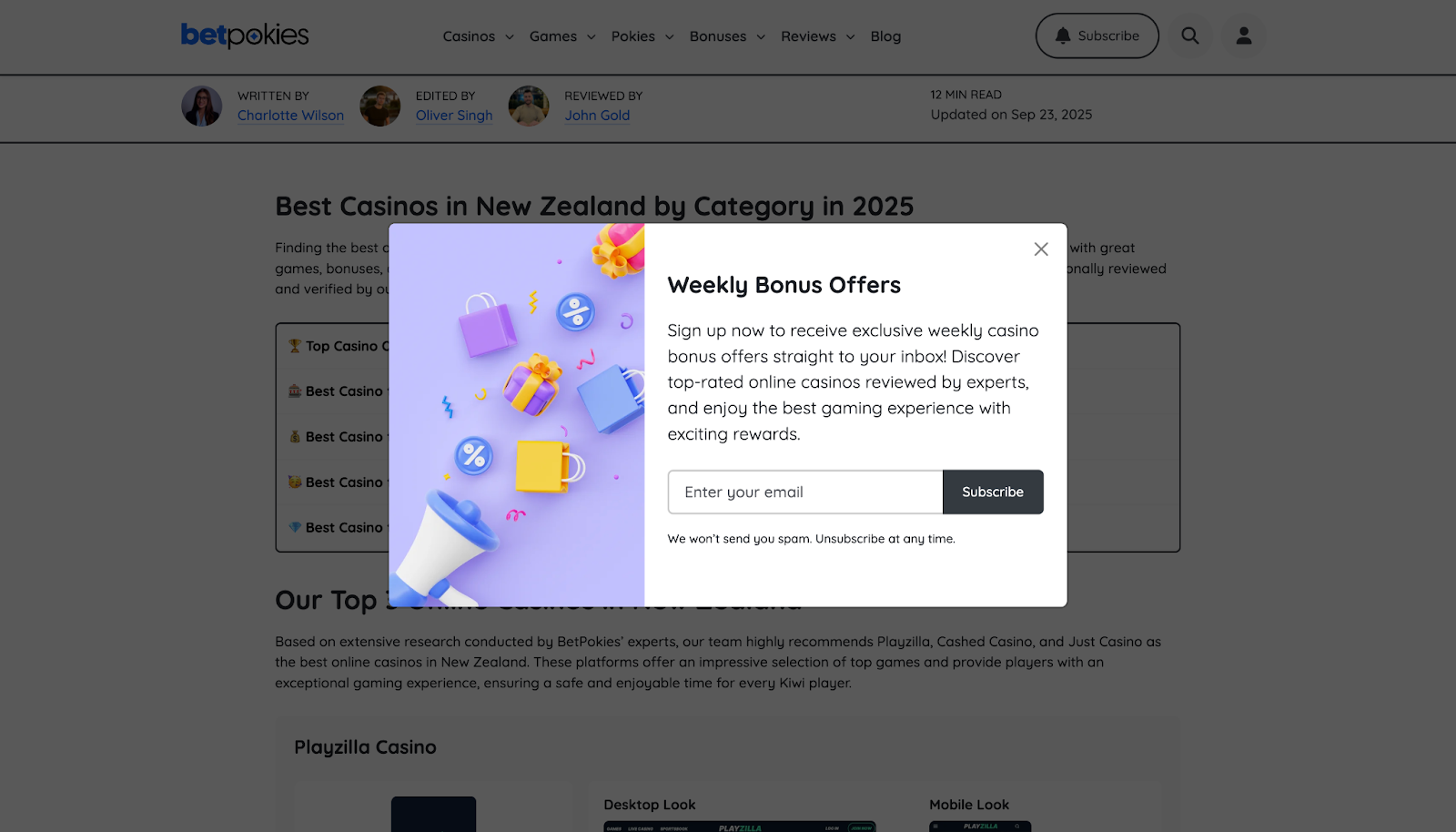 The BetPokies NZ team believes that there is no limit when it comes to growth and improvement. Therefore, in March 2025, the website was fully relaunched to implement new features for its users. Currently, the platform is so much more seamless and lag-free. Customers can share their reviews, experiences, and thoughts regarding different aspects of online casino gambling right on the BetPokies NZ website. Also, there is an innovative dispute resolution system, user and casino-dedicated dashboards, an automated ranking system, and so much more. Yet, one of the most interesting improvements, in our opinion, is a new opportunity to set up an account on BetPokies.co.nz and even subscribe to receive weekly bonus offers.