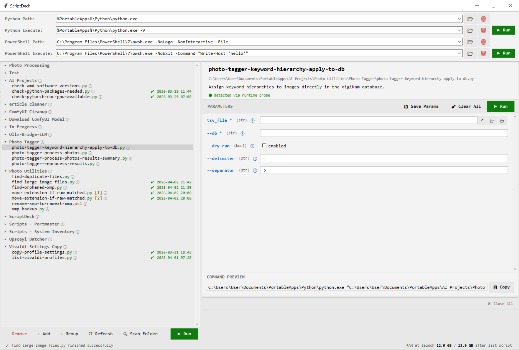 AI, particularly Claude and Gemini, has gotten really good at generating Python and PowerShell scripts. As a result, I've been creating a lot of scripts to automate and mass update things on my computer. For example, I recently did a photo library cleanup including migrating from Adobe Lightroom to digiKam and darktable. This involved renaming xmp files; finding and removing orphaned xmp files; building a keyword hierarchy; assigning descriptive keywords to photos; and moving large, unnecessary files to a separate location while keep the original RAW file in place. All of this was done by directing Claude and/or Gemini to create scripts that I then needed to test and run while also proving numerous input variables. And thus, Scriptary was born.